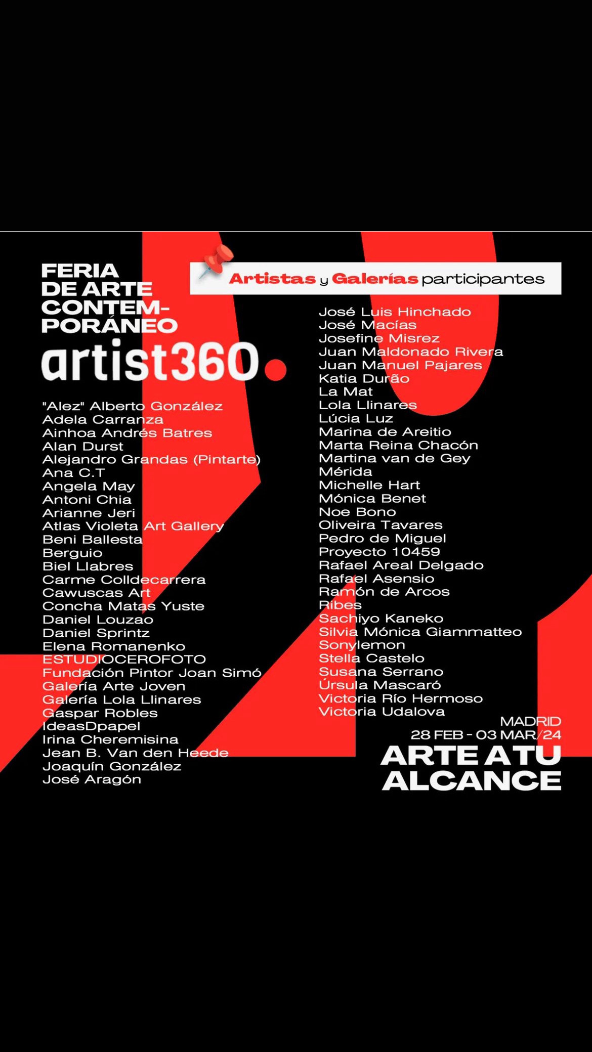 Artist360 MADRID Publicado porcarmecolldecarrera26 de febrero, 20241 de abril, 2024Publicado en Destacats, Exposicions Del 28 de Febrer fins el 3 de Març Hotel Ilunion Pio XII. Avda PioXII 77 Comparte esto: Haz clic para compartir en X (Se abre en una ventana nueva) X Haz clic para compartir en WhatsApp (Se abre en una ventana nueva) WhatsApp Haz clic para enviar un enlace por correo electrónico a un amigo (Se abre en una ventana nueva) Correo electrónico